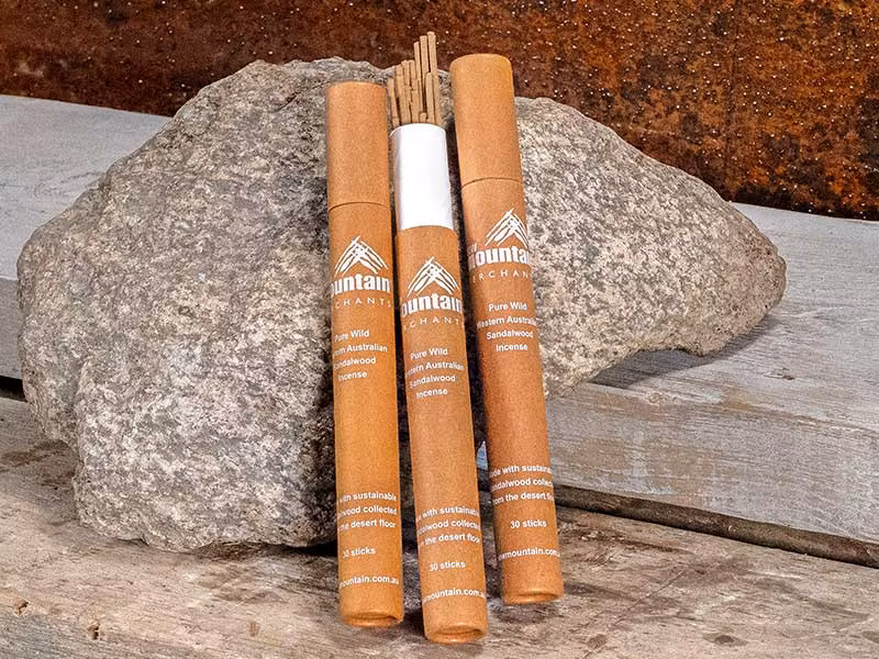 Jo det är så här att Sandelträ rökelse från New Mountain Merchants i Australien är gjort på 100% Sandelträ som har samlats in från naturligt döda träd och grenar i ökenområdena i västra Australien.