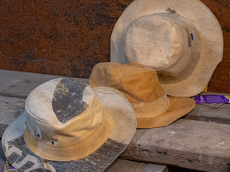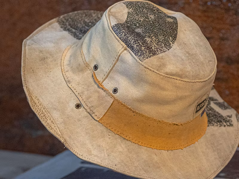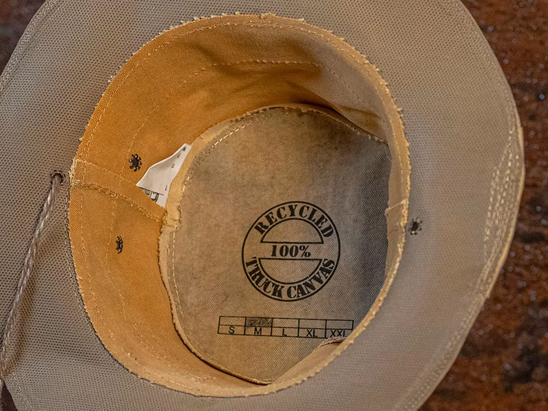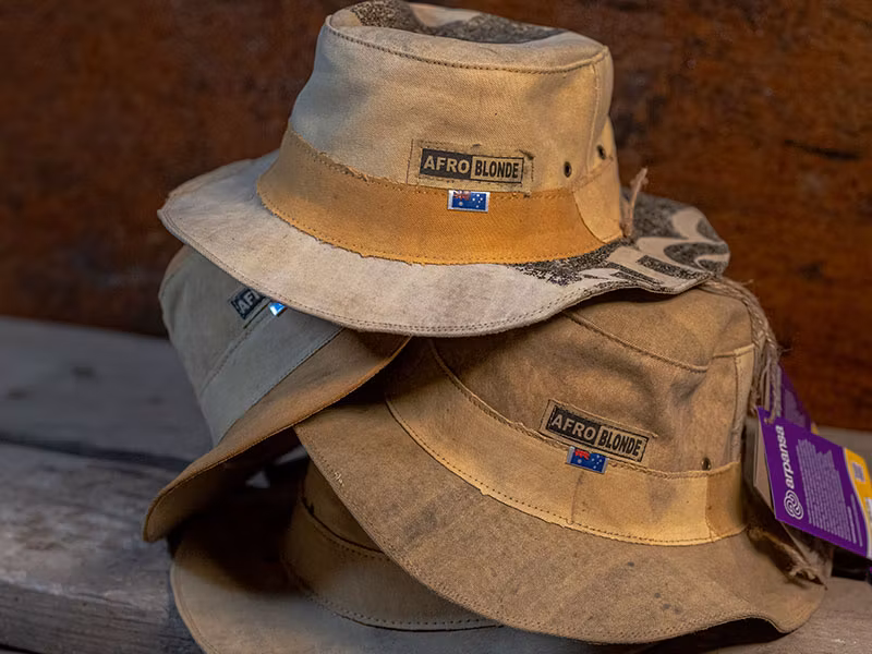 Presenningarna till dom här Bucket Tarp hattarna har rest hundratusentals mil kors och tvärs över Australiens stora vidsträckta kontinent på lastbilar och Australiska väg tåg innan de är kvalificerade för att ändvändas i Afroblonde hatt tillverkning. Det är nu de är KLARA FÖR YTTERLIGARE MILJONER MIL.