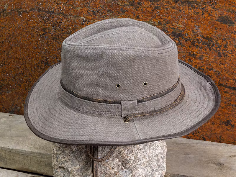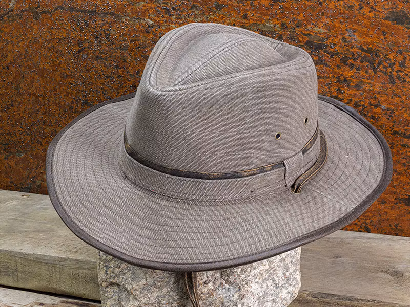En canvas hat i en Aussie drover modell sten tvättad till en sliten stil.