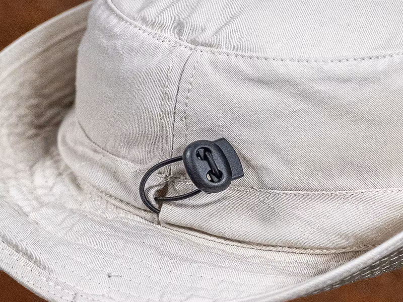 Den här modellen har snäppen så att du kan vika upp sidorna, en flexibel snodd som går att låsa för att tajta till hatten vid blåsiga förhållanden och den har även hakrem.