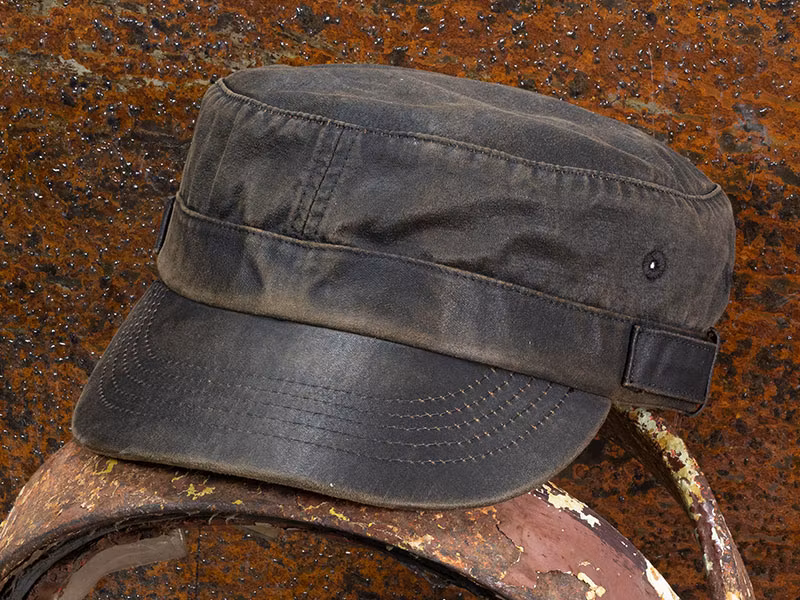 En keps i militär design gjord i vaxad bomull med en skärm av typ skärmmössa/kaptensmössa.